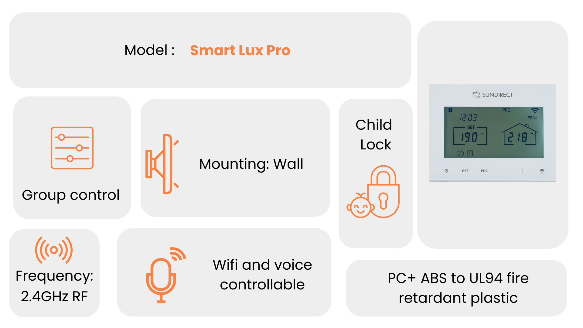 The Sundirect Smart Lux Pro is an advanced WiFi-enabled thermostat designed exclusively for the Lux-Plus series infrared heating panels with integrated lighting. With smart connectivity, dual heating and lighting control, and intelligent energy-saving functions, it offers the ultimate in convenience, efficiency, and comfort for modern living and working environments.