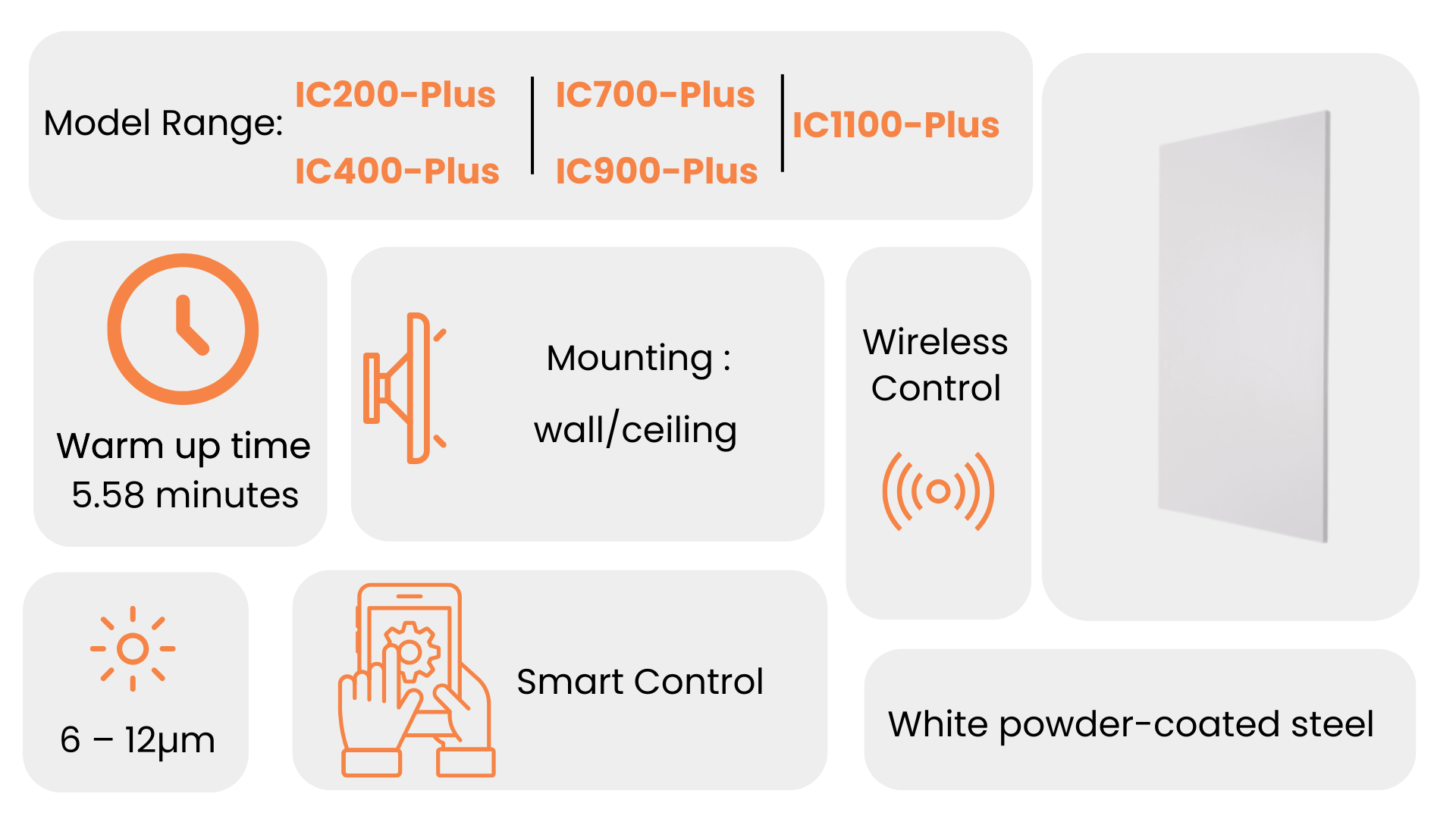 The IC Plus panels are engineered with high infrared radiation efficiency and a polished steel reflector that directs heat forward. This ensures minimal energy loss, low running costs, and sustainable performance with recyclable materials.