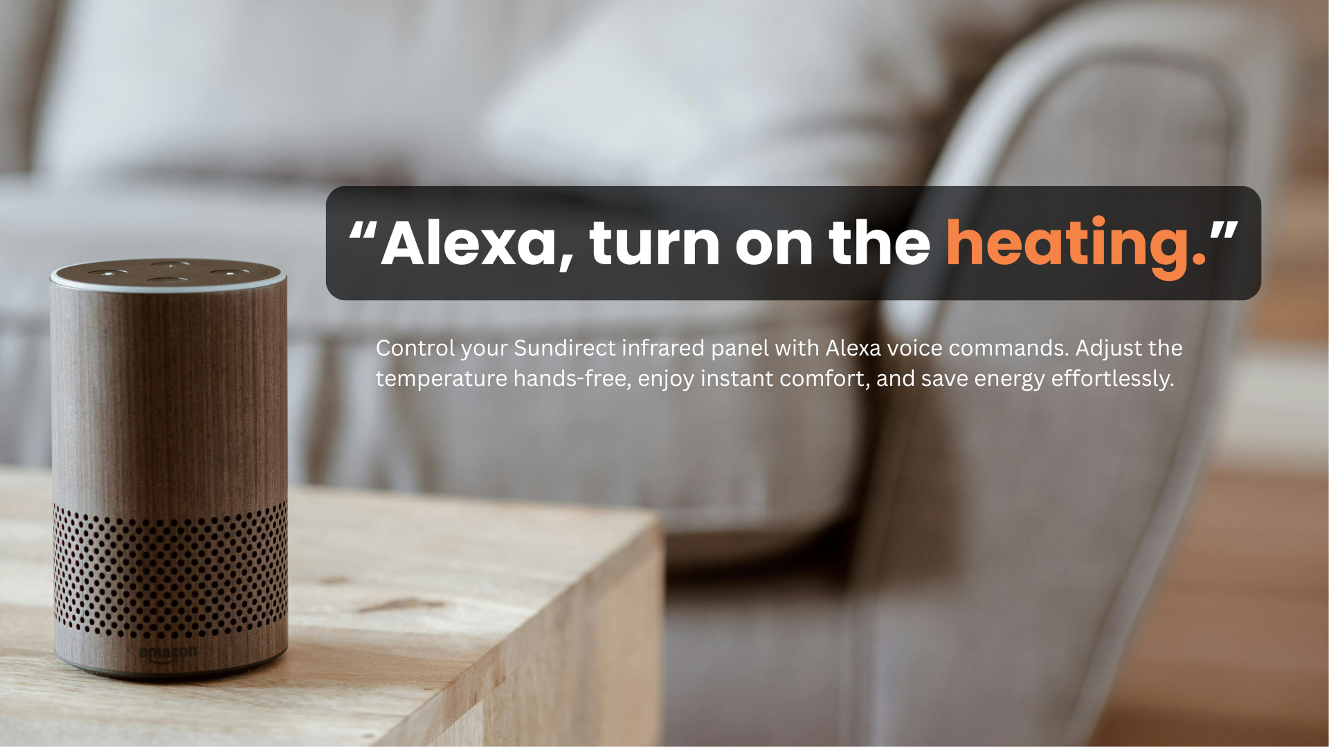 The panel includes a built-in thermostat receiver and works with Sundirect smart controllers such as Smart2.0, Smart2.0Pro (WiFi app control), and SmartPlug (Alexa and Google Assistant compatible).