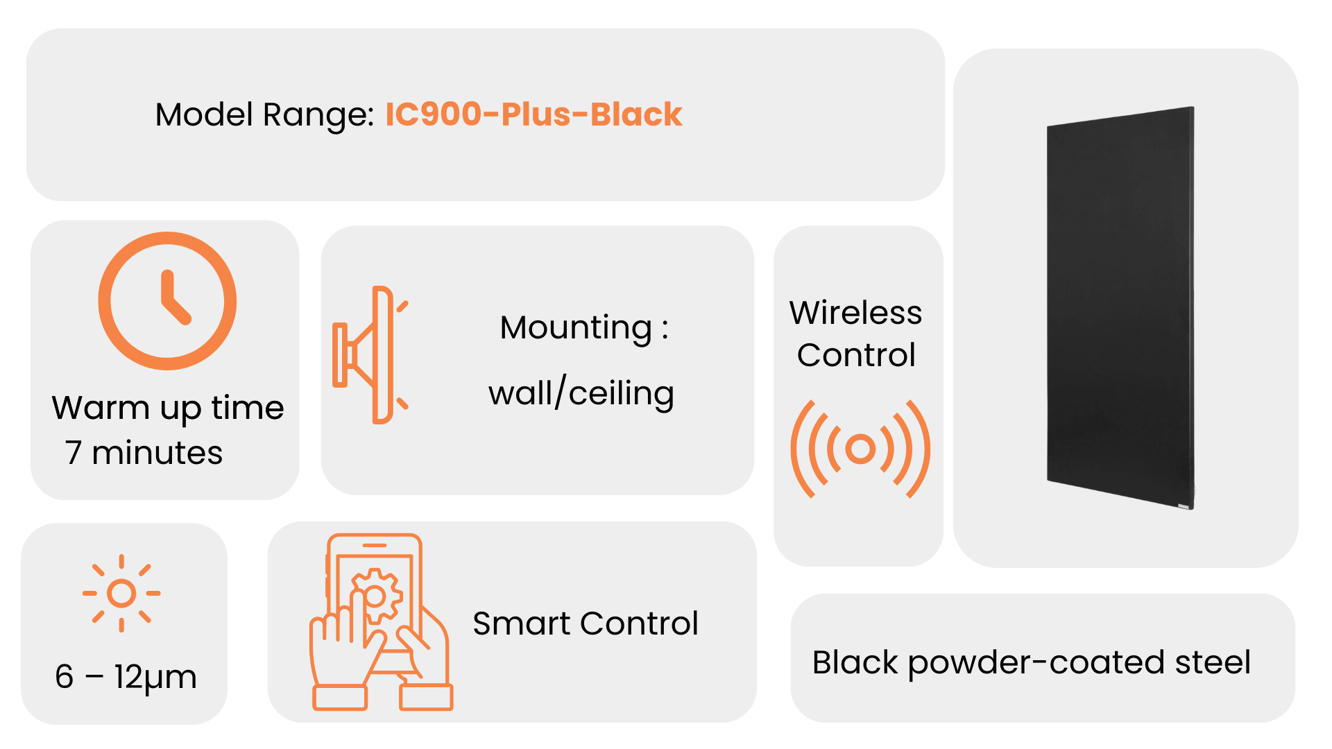 The IC900-Plus Black infrared heater delivers reliable performance while offering a dual-function design that combines comfort, smart control, and practical utility in one panel.