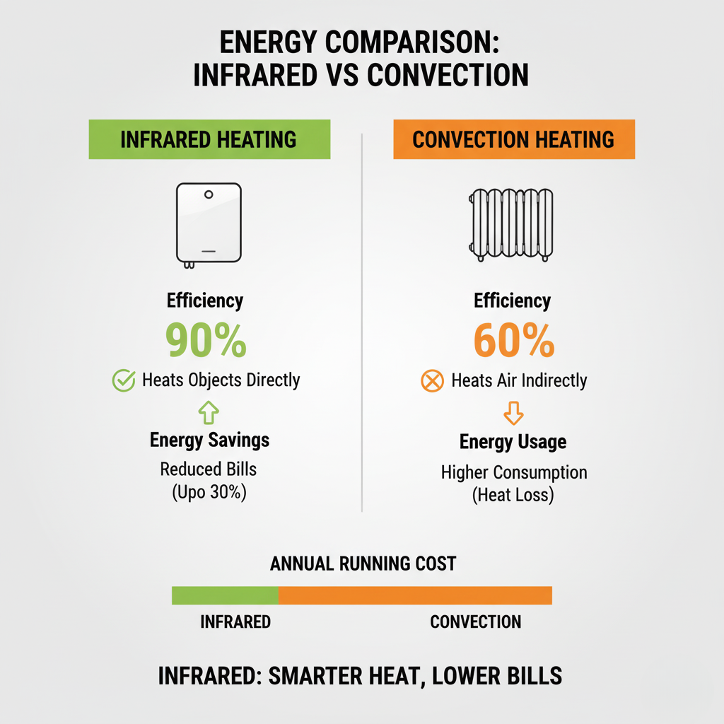 Infrared heaters deliver powerful warmth even on freezing days. Because they heat mass, not air, rooms stay warm for longer—reducing the need to run heating continuously.