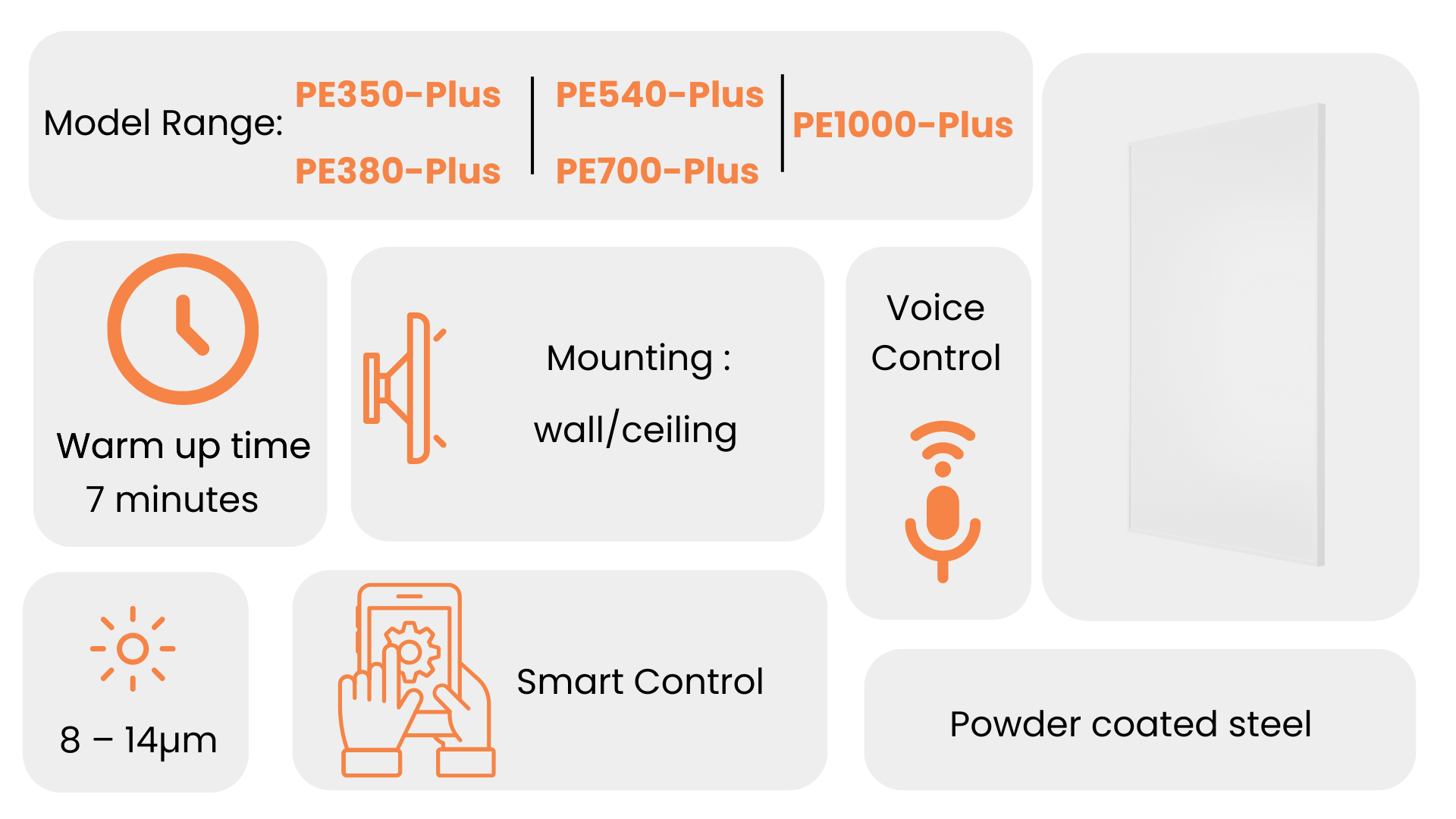 PE Plus panels can be wall-mounted, ceiling-mounted, or used portably with accessories. Sizes range from 350W (3–7 m² coverage) to 1000W (10–20 m² coverage), making them suitable for both small rooms and larger areas.
