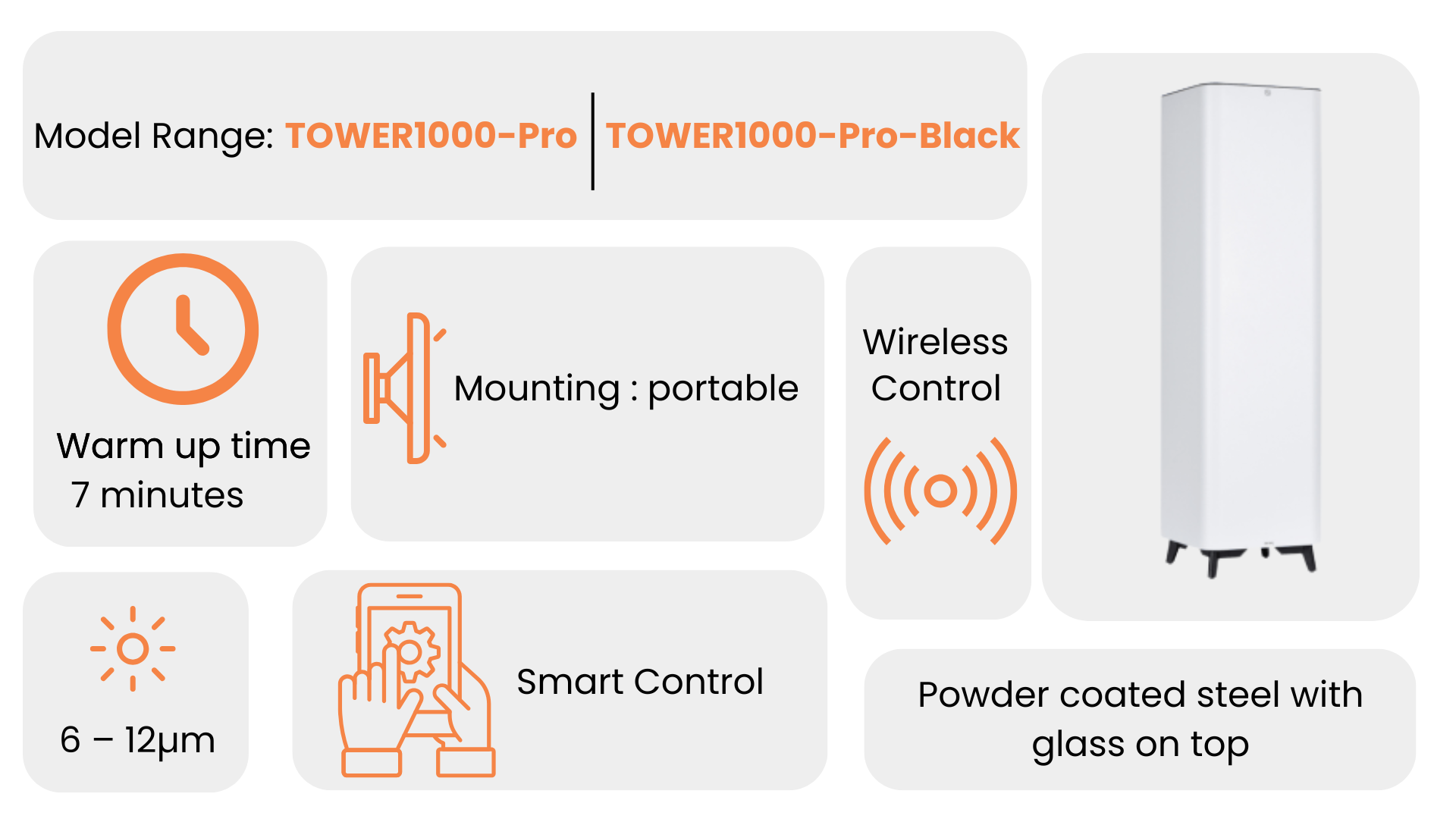 Looking for a Portable and high-performance heating solution? Explore the Infrared Heaters Tower1000-Pro Pro range and choose the perfect model for your home, business, or workspace.