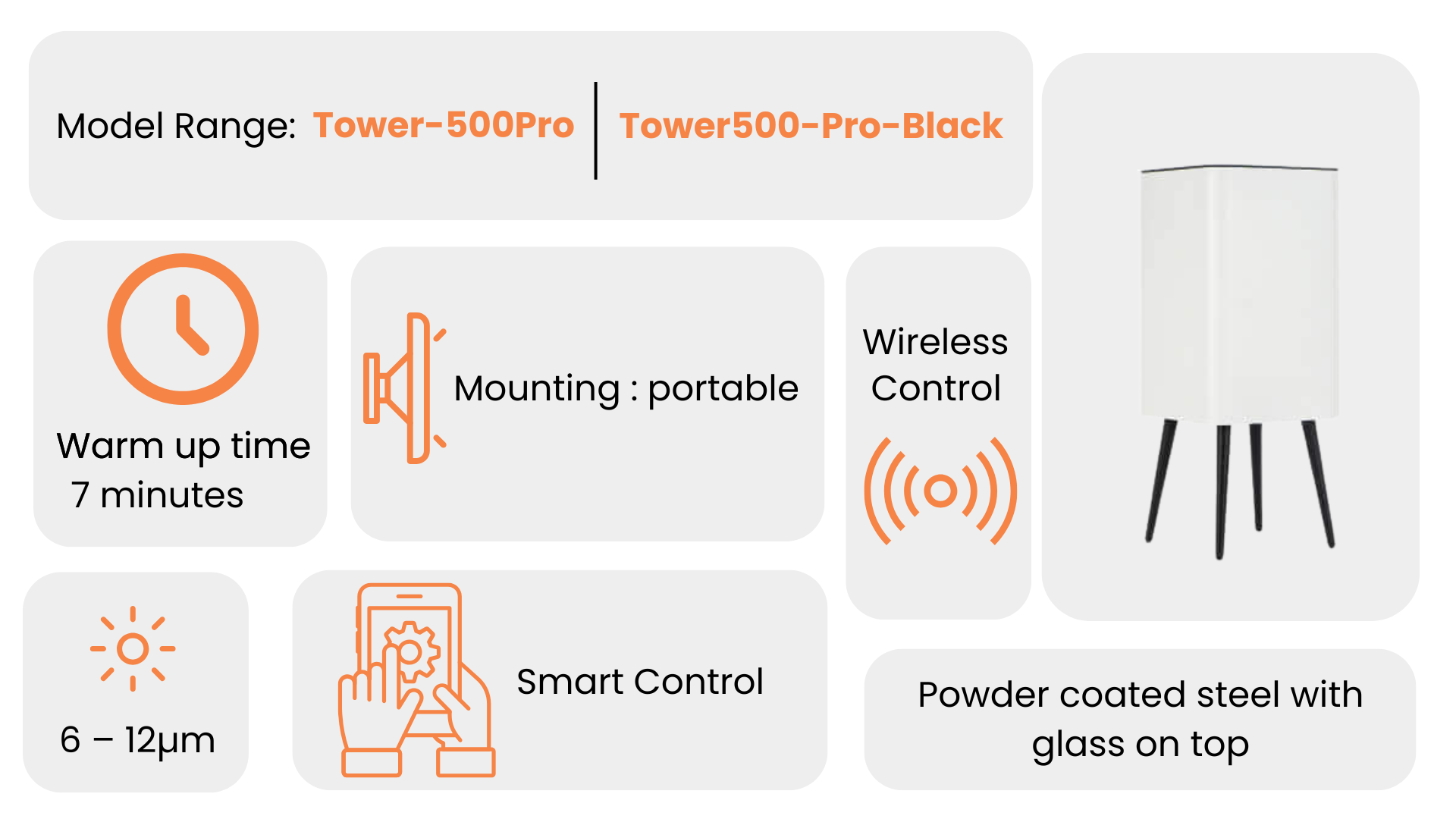 The Tower500-Pro is an innovative portable WiFi-enabled infrared heater featuring a 3-element design that provides 270° room coverage, combining efficient heating with a modern, minimalist look that complements any interior.